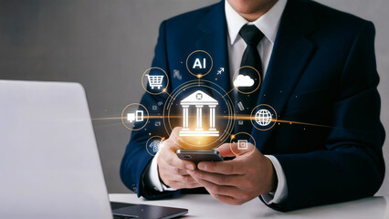 Businessman using AI banking technology on smartphone with modern financial icons, global access