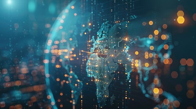 Visual representation of global connectivity, data exchange, and technological advancement with a digital earth globe and network connections.