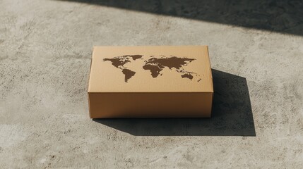 A simple cardboard box featuring a world map design rests on a concrete surface, suggesting themes of shipping or global trade.