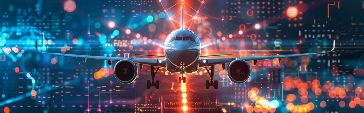 A digital airplane soars through the sky above vibrant data visuals, illustrating the future of air travel and flight safety technology advancements