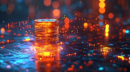 Stack of virtual coins emitting intense neon light on a high-tech circuit board, representing digital currency, blockchain innovation, and the financial transformation in global cryptocurrency economy