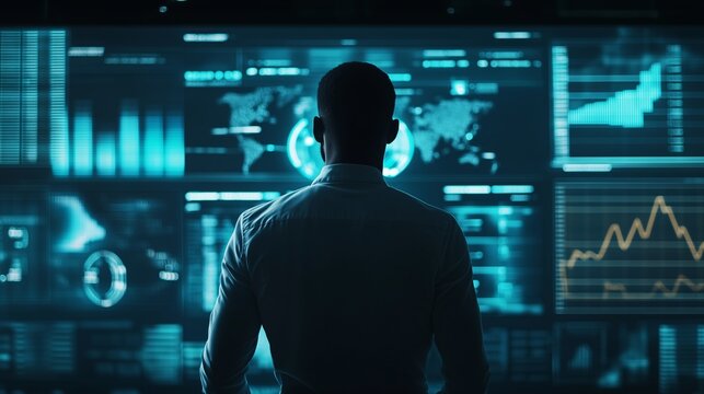 Silhouette of a woman using an advanced interactive display with global data analytics. Concept for big data, cybersecurity, or tech-driven business. Design for digital transformation presentation
