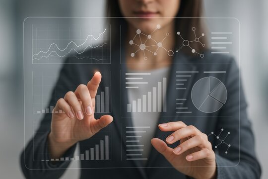 Navigating Data: A business professional interacts with a virtual interface, showcasing data visualizations and interactive elements, suggesting digital transformation.