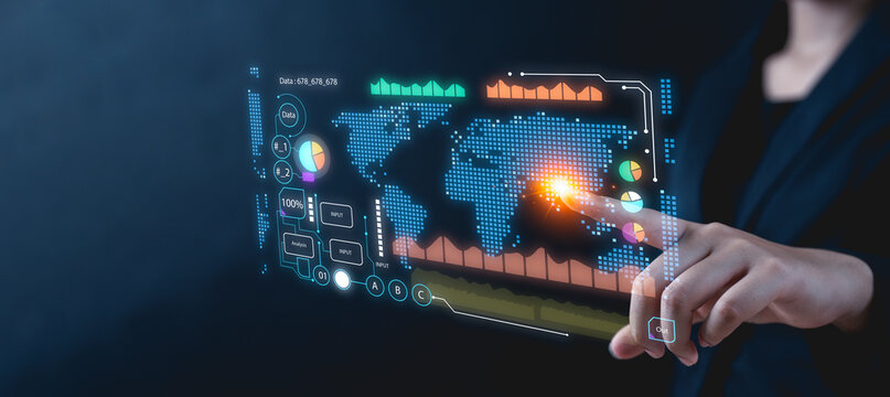 Interactive global data visualization.  A hand points to a highlighted region on a dynamic map, displaying data points and statistical trends.  Detailed analysis through visual representation