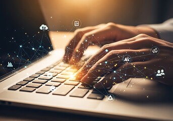 Photo of closeup of hands typing on a laptop keyboard, with glowing digital network icons symbolizing technology, data, and online connectivity in a modern workspace