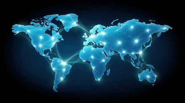 Abstract glowing world map with digital connections showcasing global network and communication technology over dark background