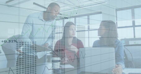 Image of financial data processing over diverse business people in office