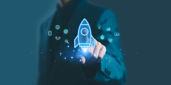 Businessman touching virtual rocket icon with digital interface, representing startup growth, innovation, business launch, technology development, and futuristic digital transformation in modern.