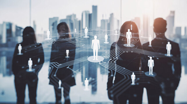 Futuristic Professional Network Concept with Diverse Silhouettes and Digital Connections
