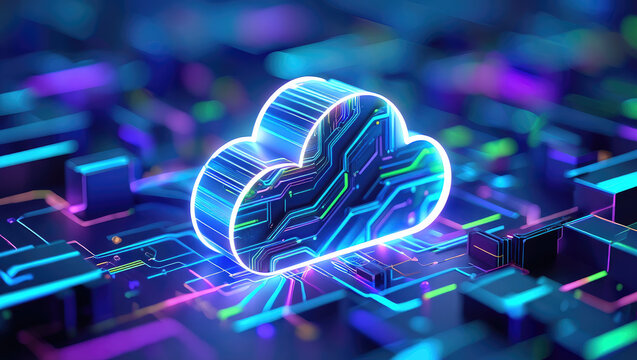 Conceptual digital cloud computing illustration features a glowing stylized cloud shape above a network of connected glowing lines, symbolizing data transfer and storage in a futuristic tech...