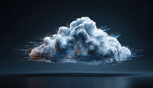Digital cloud computing concept rendered with glowing particles in dark space