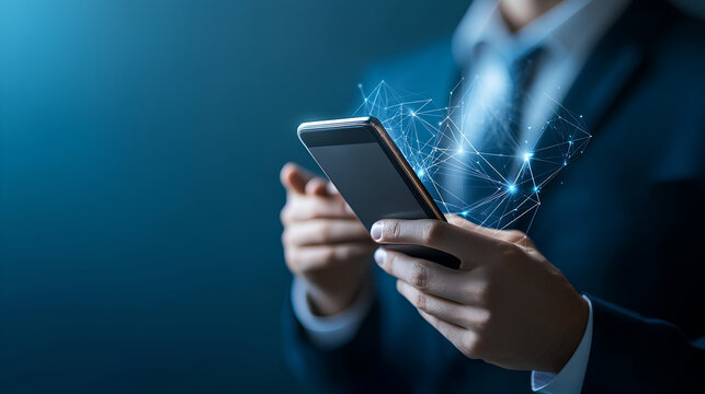 Businessman's hand using smartphone with network connection on blue background. Technology concept