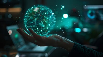 A digital representation of Earth with glowing green elements, surrounded by a futuristic circular design, set against a dark, textured background.