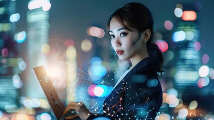 Digital data analysis on city skyline at night with stock exchange graph overlay