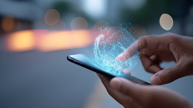 Professional businessman manipulating holographic global network interface, showcasing digital connectivity and advanced technological innovation through interactive smartphone projection