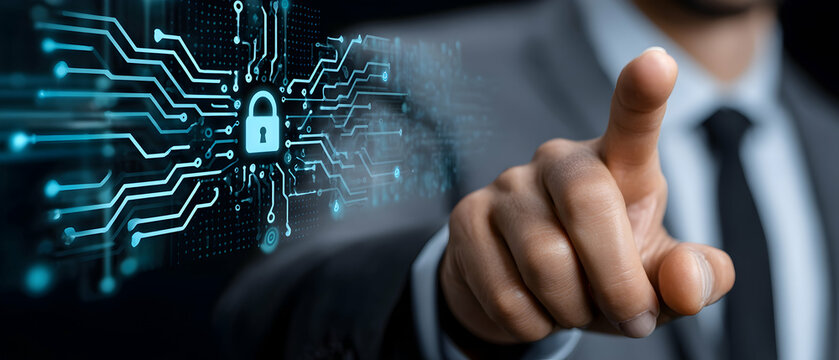 Digital interaction on illuminated touchscreen, A finger navigates through a glowing interface with advanced technology features depicted in blue tones