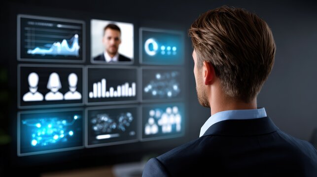 Businessman in profile contemplates glowing holographic planet and global data visualization network, symbolizing artificial intelligence, digital transformation, and futuristic technology concepts.
