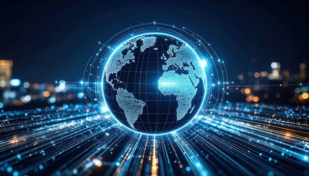 Digital earth with radiating lines representing global connectivity