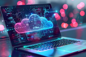 Futuristic Cloud Computing and Network Interface on Laptop Screen. A modern laptop displaying a dynamic cloud computing interface with intricate network connections and cogwheels. Vector