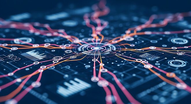 Central glowing hub with radiating digital circuits and data streams, symbolizing network connectivity and complex information processing