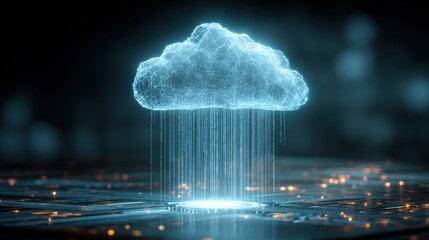 Dynamic data center with glowing cloud and digital streams symbolizing connectivity and information flow