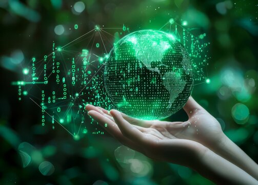 A digital illustration depicting a world map overlaid with binary code, showcasing a hand holding a glowing Earth sphere to symbolize the concept of global digital data transfer