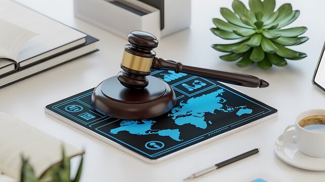 A graphic representing law, justice, or legal authority, possibly in a global context, given the map graphic.