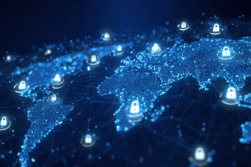 secure global connection, world map with shield icons and encrypted lines, cybersecurity concept