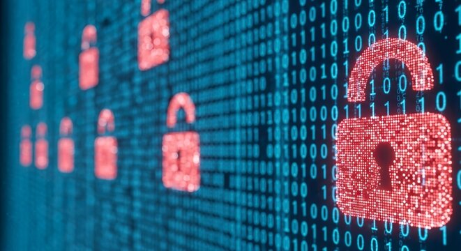 Secure digital data representation with binary code and padlock symbol