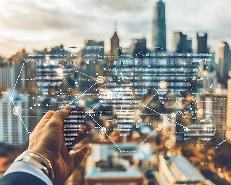 Global Network Connections Over a Cityscape at Dusk, Showcasing Digital Data Flow and Interconnectedness Between Continents and Regions