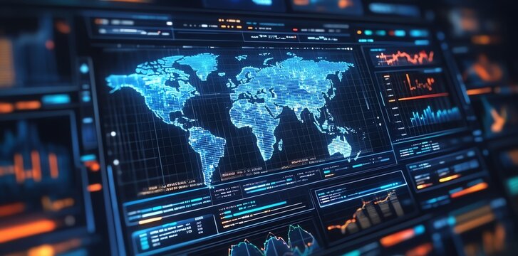 A close-up shot of a computer screen displaying a world map, charts, and graphs in a futuristic design.