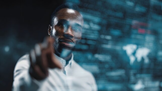 Man points at a futuristic digital interface with global data and map symbolizing technology and connection