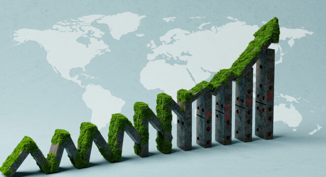 Global financial market growth represented by a rising bar chart and line graph against a world map backdrop, symbolizing economic progress and investment trends