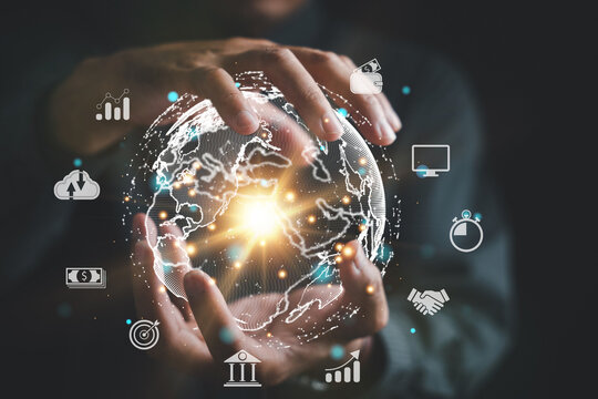 Tech driven Global Business, Businessman embraces technology as he analyzes big data for business intelligence. composition of world map digital links emphasizes interconnectedness of global market.