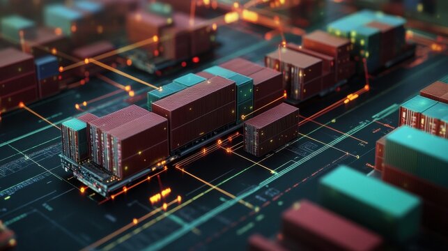 A vibrant array of shipping containers on a circuit board background illustrates the integration of logistics and technology in modern trade.