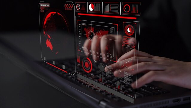 Person using laptop with futuristic digital interface showing data analytics and visualization