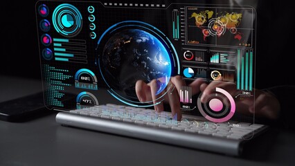 Hands typing on laptop with holographic world map and data analytics overlay for business