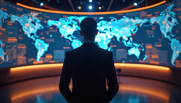 Man in suit stands before large digital world map display. Data visualizes global connections and information flow. Modern newsroom displays tech network on screen.