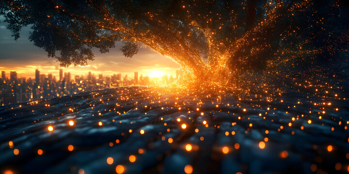 A stunning representation of a global digital network, featuring interconnected nodes, glowing data streams, and a sunrise over the Earth. The image symbolizes global connectivity, blockchain technolo