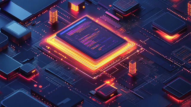 Abstract isometric user interface design with glowing digital blocks on a minimal background, representing business systems, global networks, big data, and smart app concepts in 3D.