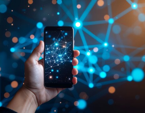 Hand holding a smartphone displaying a glowing digital network, symbolizing global communication and advanced technology in a futuristic setting of data connection and innovation