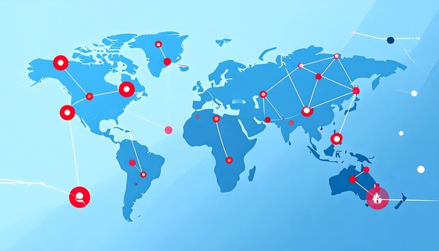 A stylized world map with connecting lines and red circles indicating locations on a blue background