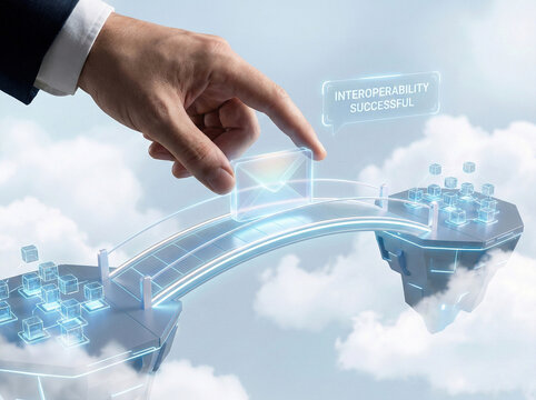 Successful cross-chain interoperability concept showing data transfer between blockchain networks in the clouds.