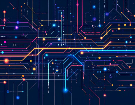 Colorful abstract technology background with glowing circuit lines and data points on a dark blue canvas