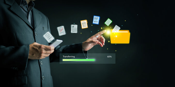 Businessman using smartphone to transfer digital documents into cloud folder, representing data synchronization, secure file sharing, and modern information technology.