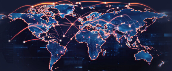 Abstract digital illustration showing a global network in red and blue hues, with intricate circuit patterns over a world map. The image highlights international interconnectedness and data flow.