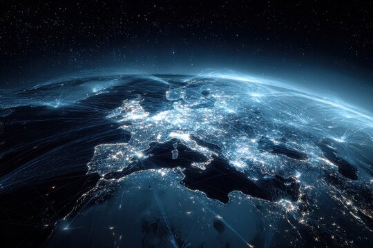 Global network connections illustrate digital links across Europe at night showcasing data flow and technological integration over the continent