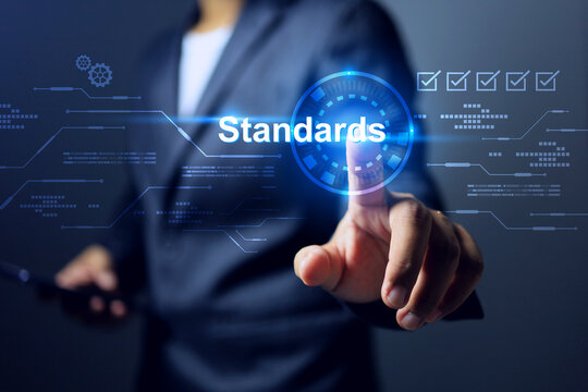 standard concept with businessman pointing on standards info graphic to implement the requirement to complied regulation and company integration improvement