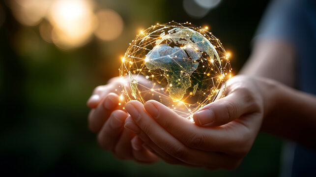 Faceless hands against natural background holding glowing global network sphere, customer data connection, environmental technology integration, digital transformation, worldwide c