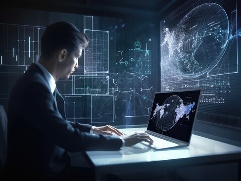Businessman works with financial data. Futuristic interface above computer. Interactive financial diagrams and digital data visualization concept. Global e-business network communication